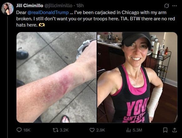 Jill Ciminillo admitted in a post on X (formerly Twitter) that she was carjacked in Chicago and had her arm broken in the process. Yet instead of supporting Trump’s effort to restore order, she told the President to stay away: