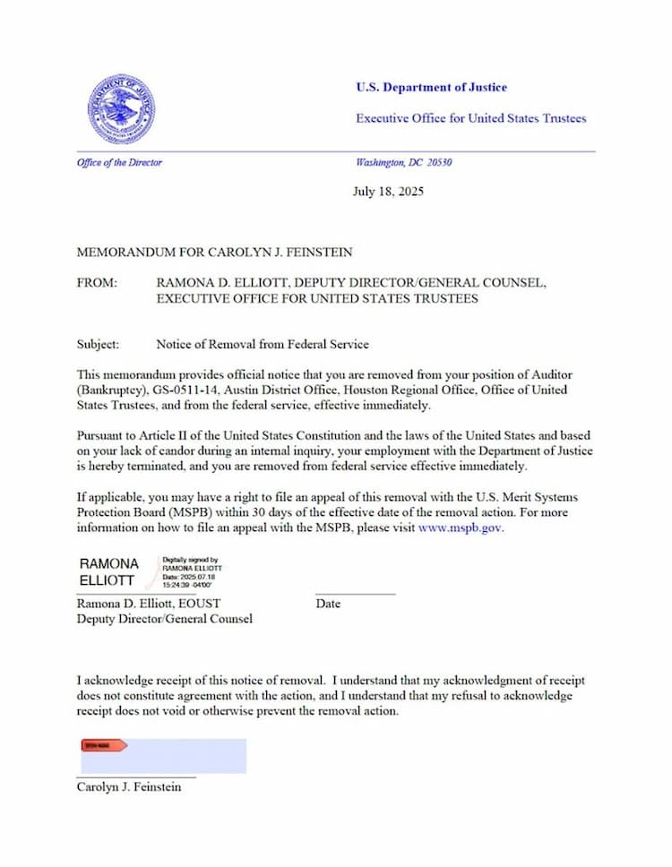 The termination notice cites Feinstein’s lack of candor during an internal inquiry as contributing to her firing.