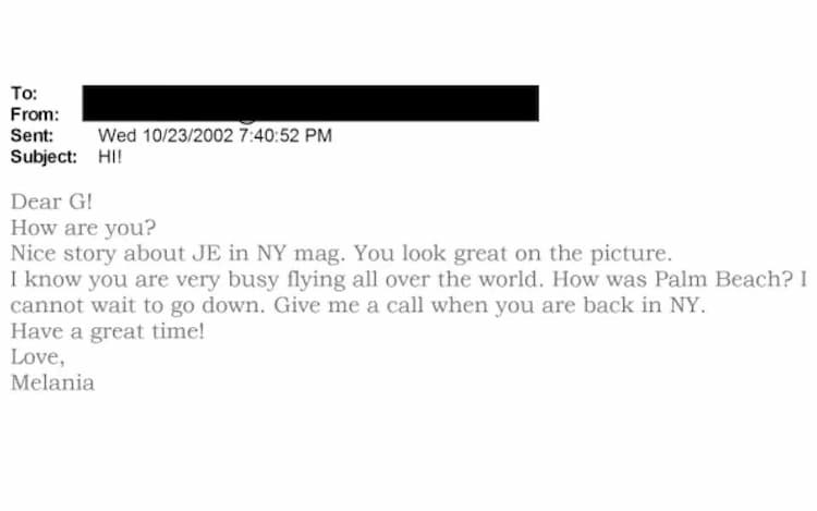 In a 2002 email addressed to “G” and signed “Love, Melania”, Trump apparently told Maxwell she looked great in a photo featured in a New York Magazine profile of Jeffrey Epstein. She described the piece as a “nice story”.