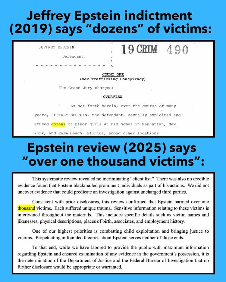 “Consistent with prior disclosures,” the Justice Department memo said this week, “this review confirmed that Epstein harmed over one thousand victims.”