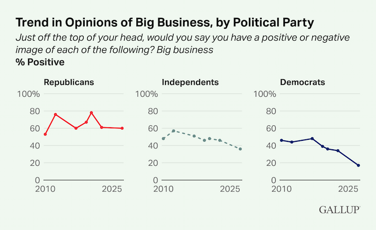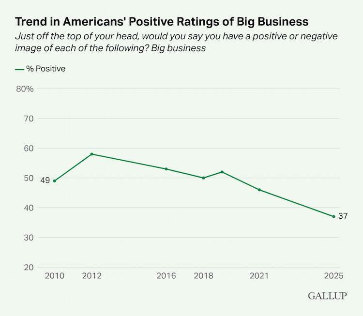 Perceptions of big business have tumbled in recent years, including a nine-point decline this year on top of a six-point drop in 2021. In 2019, a slim majority of 52% of Americans still had positive views of big business. The high point was 58% in 2012.