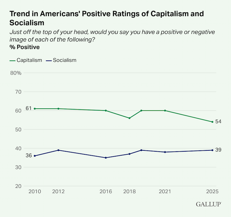 Americans are more positive toward capitalism than socialism, but the 54% viewing capitalism favorably is down from 60% in 2021 and near that level in most prior years. Americans remain more negative (57%) than positive (39%) toward socialism, with little movement in these attitudes over time.