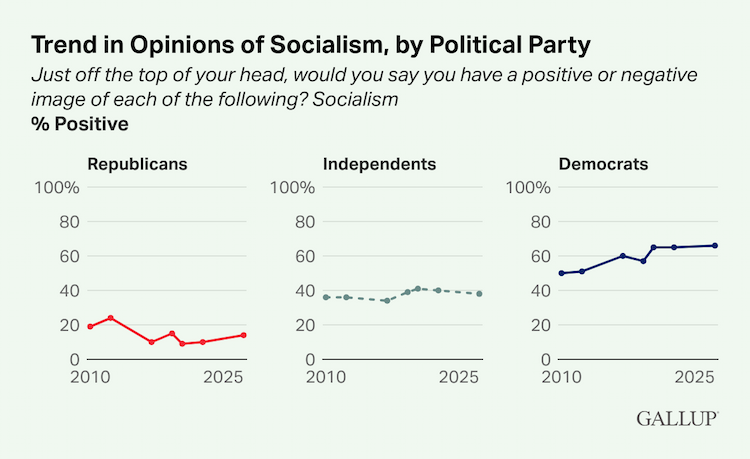 Americans overall continue to be skeptical of socialism, but Democrats are the exception. Since 2016, more Democrats have held positive views of socialism than of capitalism, with the gap expanding to 24 points today. Democrats’ more positive views of socialism occur at a time when many high-profile Democratic officials — most notably, Sen. Bernie Sanders and Rep. Alexandria Ocasio-Cortez, as well as New York City mayoral candidate Zohran Mamdani — have identified themselves as Democratic socialists and advocated policies calling for a significantly expanded government role in economic matters.