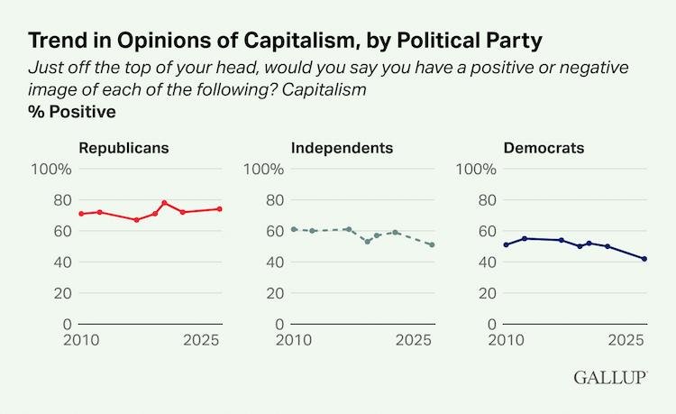 Democrats and independents view capitalism less positively this year, each showing eight-percentage-point declines since 2021. For the first time, less than half of Democrats (42%) view capitalism positively, while a slight majority of independents (51%) still do. Republicans’ views are essentially unchanged, with three-quarters holding a positive opinion.