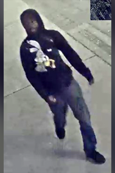 Authorities are searching for a person of interest who was last seen in surveillance footage sporting blue jeans and a dark hooded sweatshirt with a white cartoon rabbit.