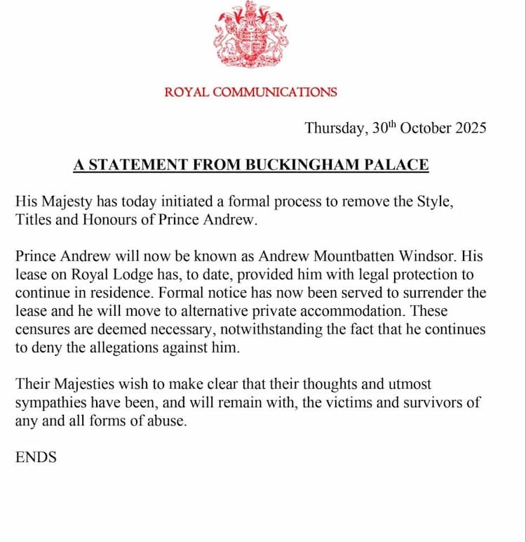 The King has removed Prince Andrew’s remaining titles and will evict him from Royal Lodge.