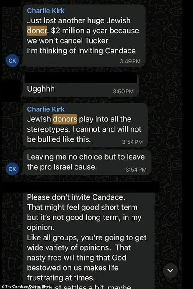 The bombshell revelation comes after Candace Owens released a screenshot of Kirk fuming in a group chat that Jewish donors were pulling funding over his links to Tucker Carlson.