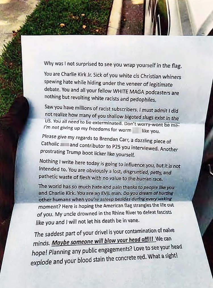 Following the press conference on Friday, authorities released an image of the letter Johnson was allegedly sent, which accused the conservative of being a 'revolting white supremacist and pedophile.'