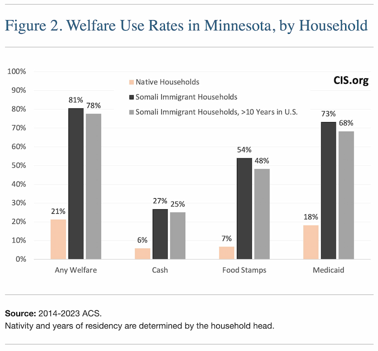 For example, 89 percent of Somali-headed households with children in Minnesota are on one or more forms of welfare, as 86 percent are on Medicaid. About 62 percent of Somali households with children in the state are on food stamps, while 23 percent take cash welfare.