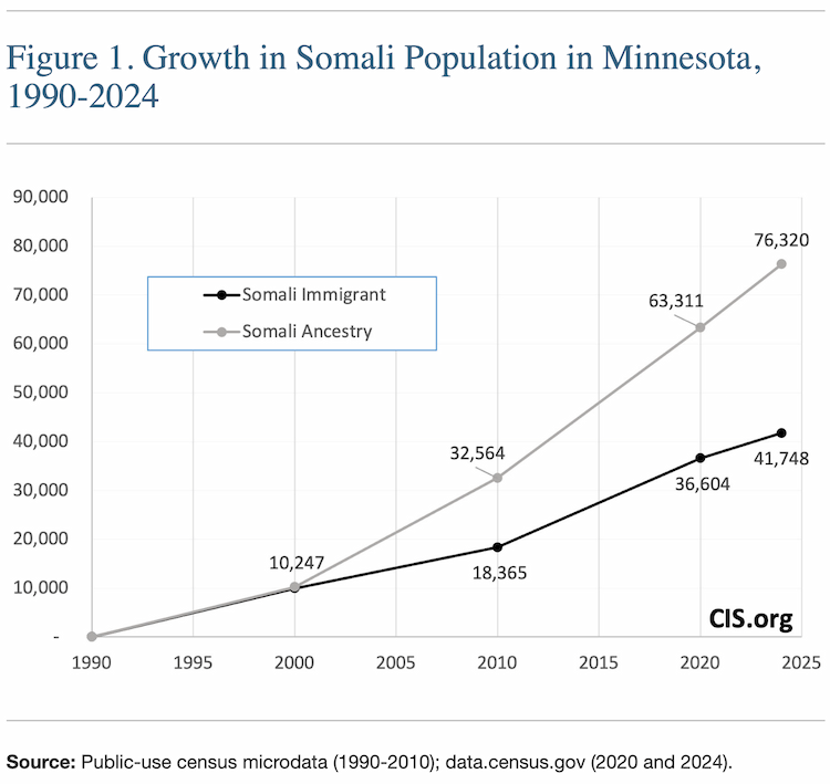 The data, based on 10 years of data from the Census Bureau’s American Community Survey (ACS), shows drastic disparities between native-born American households and Somali-born households in Minnesota, where nearly 80,000 residents have Somali ancestry compared to zero who had Somali ancestry in 1990.