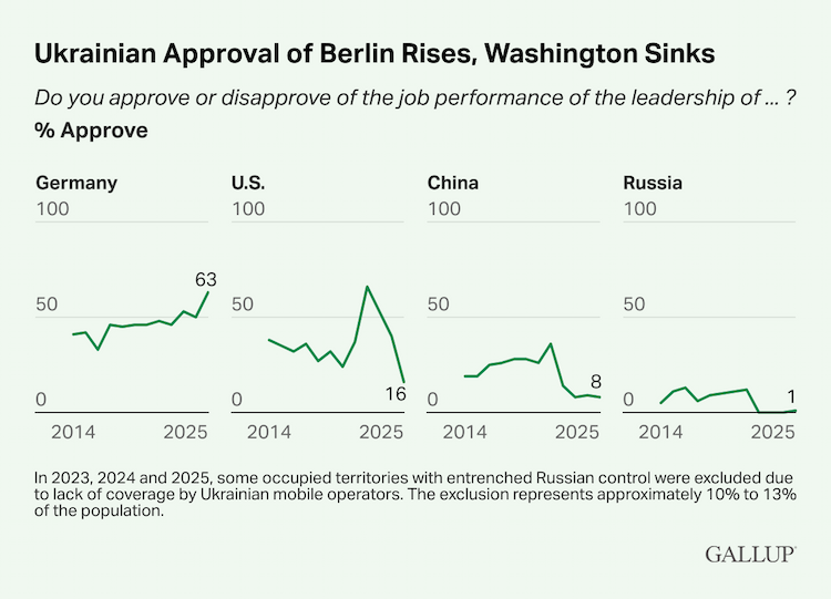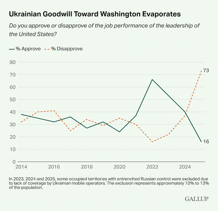 Ukrainians’ views of their most prominent military ally have shifted decisively since the early months of the war. In 2025, 16% of Ukrainians approve of U.S. leadership, while 73% express disapproval, a record high. All of the goodwill that Washington built up in 2022, when 66% approved of U.S. leadership, has evaporated.