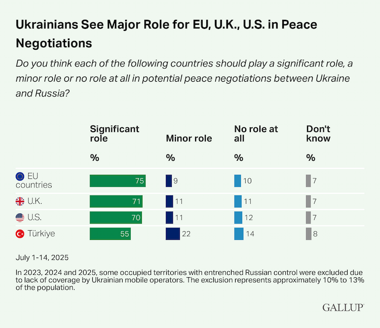 Despite sharp disapproval of U.S. leadership, most Ukrainians still view Washington as having a meaningful role to play in resolving the conflict. Seventy percent believe the U.S. should play “a significant role” in peace talks, in line with views toward EU countries (75%) and the U.K. (71%). Although some negotiations have recently taken place in Türkiye, 55% of Ukrainians support its significant involvement, notably lower than support for the EU, U.K. and U.S.