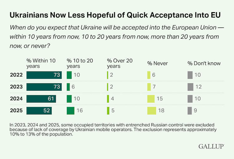 Hopes for a future within the EU have not fallen as much as they have for NATO but are still dampened compared with earlier in the war. A slim majority of Ukrainian adults (52%) expect Ukraine to be accepted into the EU within the next decade, compared with 61% last year and 73% in 2022 and 2023.