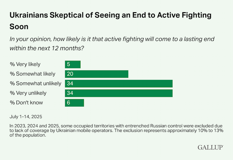 More than three years into the war, Ukrainians’ support for continuing to fight until victory has hit a new low. In Gallup’s most recent poll of Ukraine — conducted in early July — 69% say they favor a negotiated end to the war as soon as possible, compared with 24% who support continuing to fight until victory.