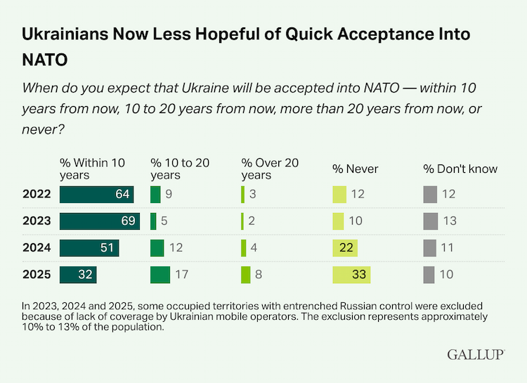 Hopes for a quick accession to NATO fell to 51% last year and have continued a downward trend, reaching 32% in 2025, half as high as in 2022. Meanwhile, the percentage who believe Ukraine will never be accepted into NATO has jumped to 33%, in line with the percentage expecting to join within the next 10 years.