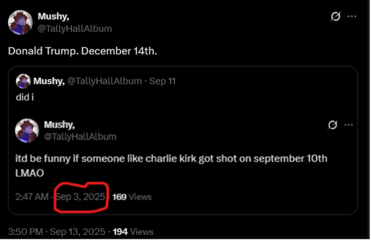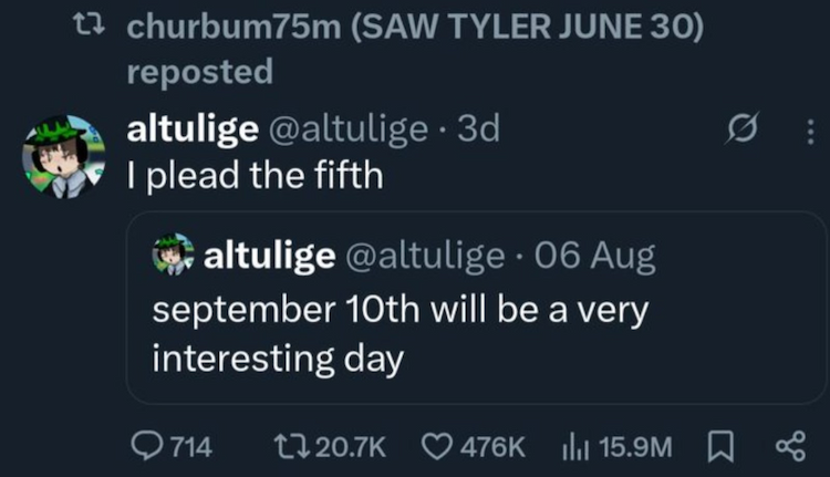 Another account posted on August 6—more than a month before the shooting—that "september 10th will be a very interesting day." After Kirk’s assassination, the account followed up: "I plead the fifth."