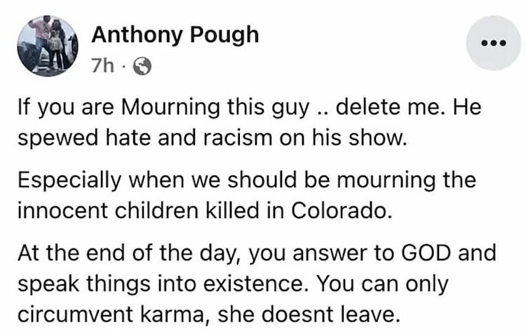 “If you are Mourning [sic] this guy .. delete me. He spewed hate and racism on his show,” Pough wrote in a Facebook post on Thursday, first reported by RealClearPolitics.