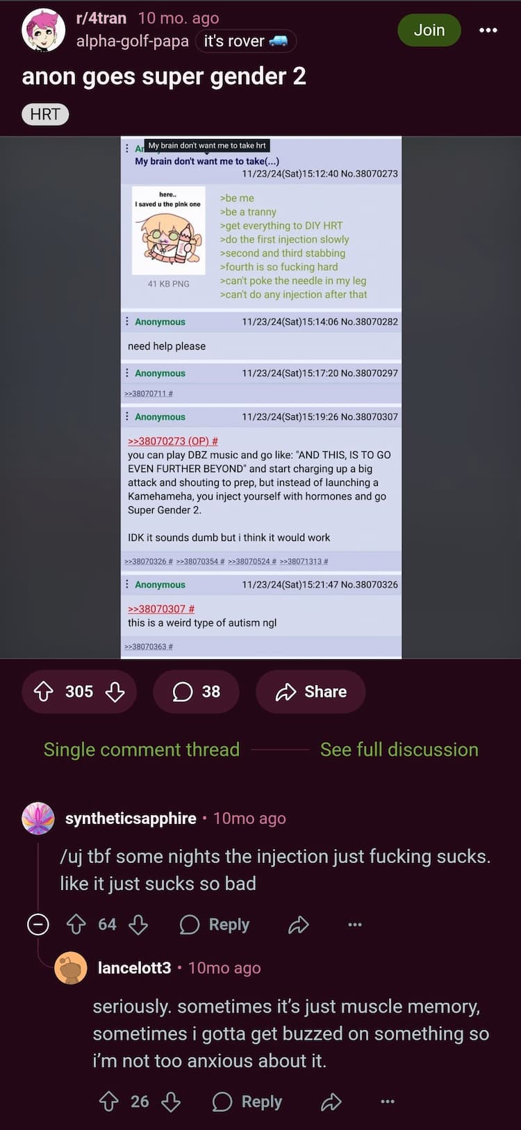 “Trump winning has motivated me to finally fix my life,” the 4tran post read. “I won’t let the idiot cisfags who want me to be miserable win. I’ll be independent, fit, happy, and trans and they can’t stop me.”