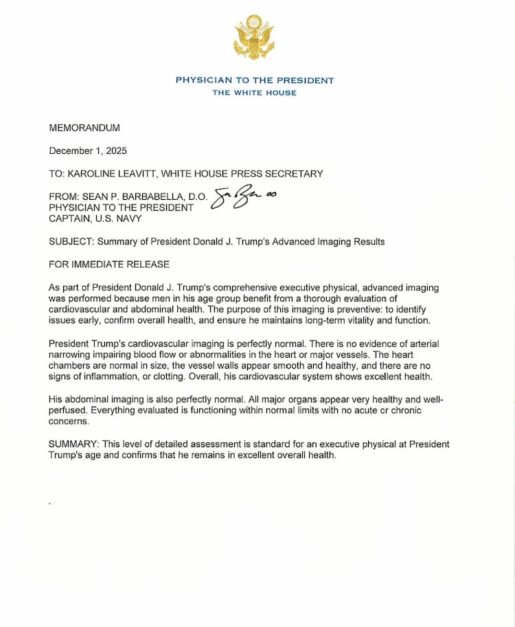 “As part of President Donald J. Trump’s comprehensive executive physical, advanced imaging was performed because men in his age group benefit from a thorough evaluation of cardiovascular and abdominal health,” Barbabella wrote.